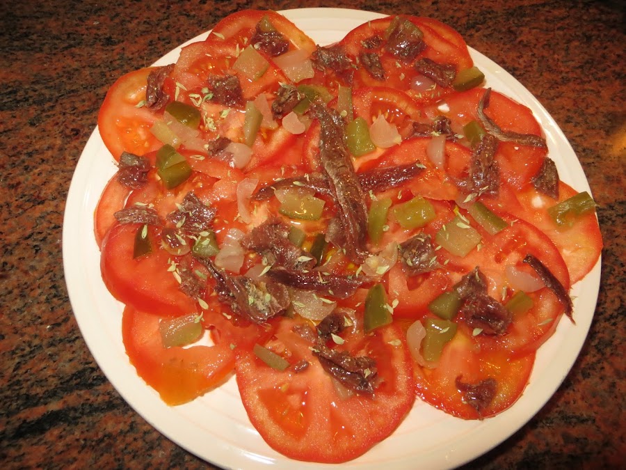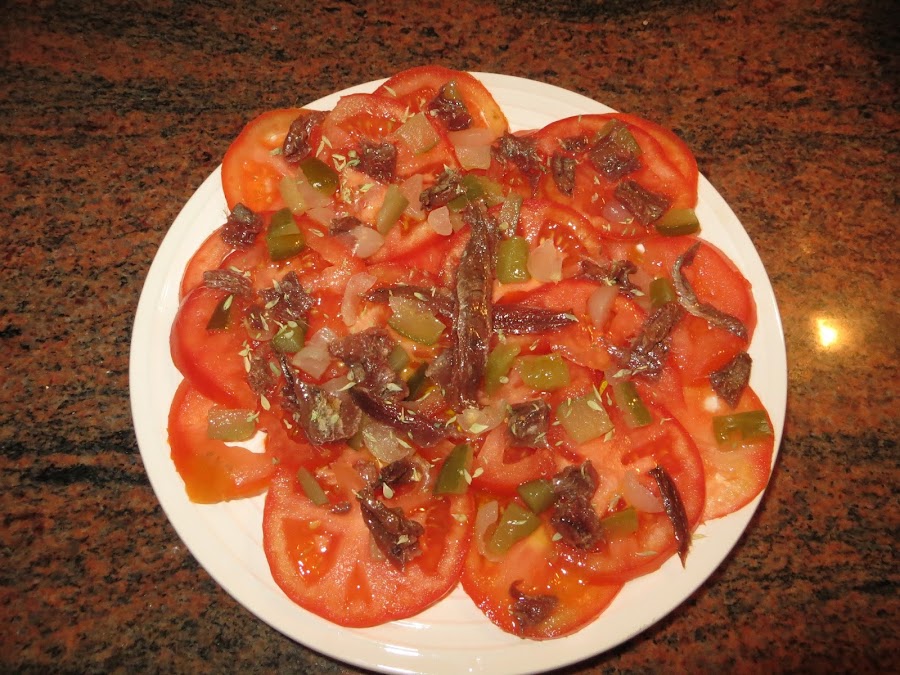 Colocamos en el plato las rodajas de tomate y echamos por encima las anchoas, el pepinillo y la cebolleta. Echamos un pelín de sal (ya que le hemos puesto anchoas), un chorro generoso de aceite y un poco de orégano. Lo llevamos a la mesa y a comer.