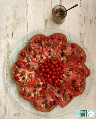 Para la salsa, emulsionar con una batidora todos los ingredientes, probar por si encontramos que hay que rectificar de sal, yo lo encontré suficiente con la salsa de soja, repartir unas alcaparras y un poco de la salsa encima de las rodajas de tomate; presentar el resto de la salsa aparte en un vaso para que cada uno se sirva al gusto.Bon Profit!