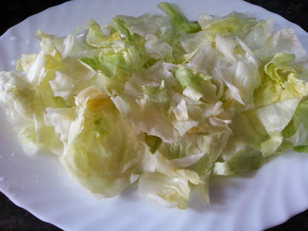 A continuación, cortamos y lavamos la lechuga. Escurrimos y colocamos como base en una bandeja.