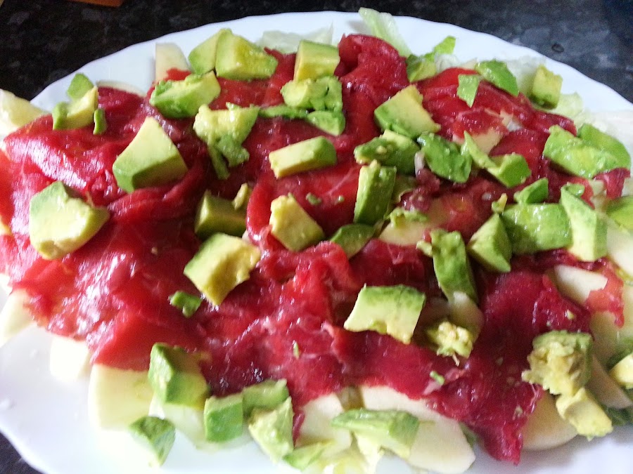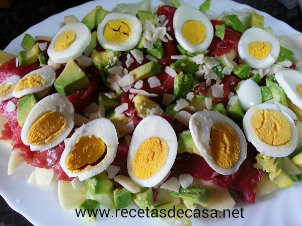 Cortamos el aguacate en cuadrados y lo repartimos por la ensalada.