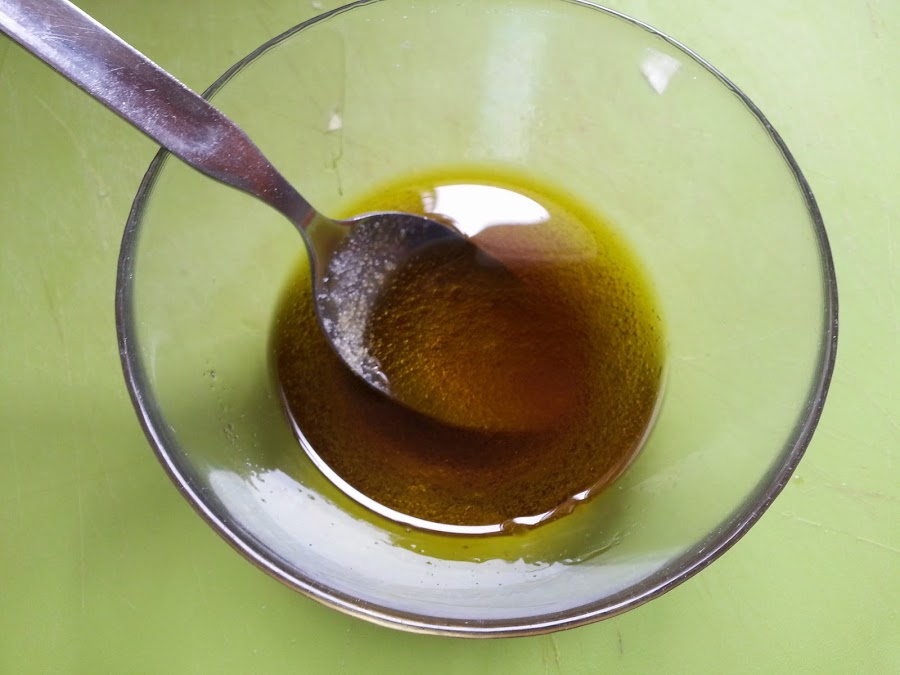 Y preparamos la vinagreta o la tendremos ya preparada. Para ello, en un bol ponemos 6 cucharadas de aceite de oliva, 4 cucharadas de vinagre de jerez y sal. Mezclamos bien.