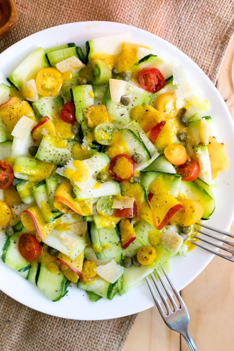 Se trata de un carpaccio con zapallito italiano, tomates cherry y mango, que le aporta un toque dulce delicioso. Además lleva un dressing de mostaza-miel que le da el punch perfecto.