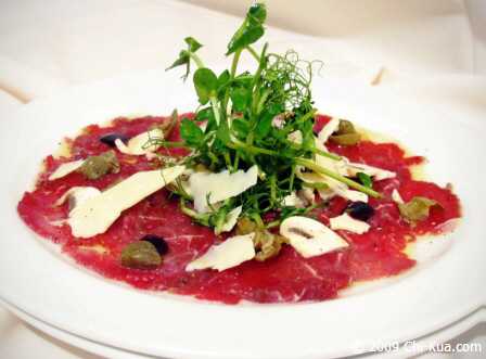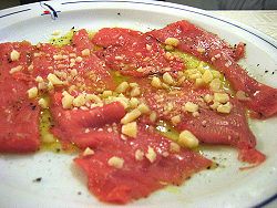 El carpaccio es una preparación en finas láminas de una carne o pescado, crudo. Dentro de las carnes la más usada es la de ternera.Aceite de oliva y algunas gotas de limón, todo ello decorado con virutas de parmigiano Reggiano. Es posible encontrar carpaccio de ñu o bovino, avestruz, toro o potro.