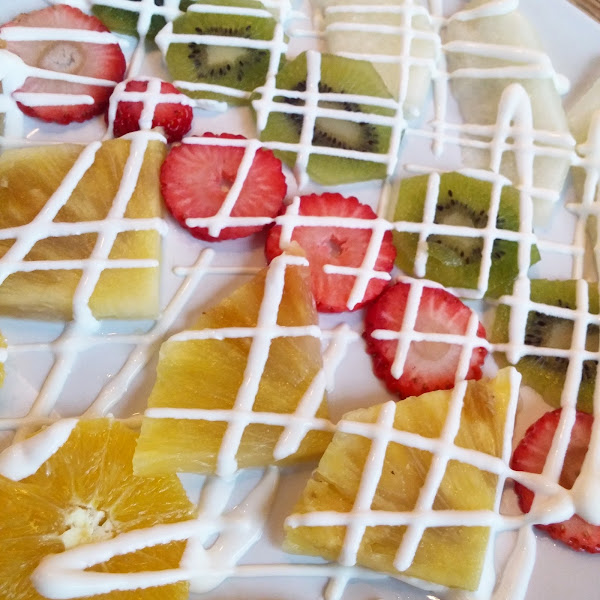 Peláis y cortais bien la fruta muy finita (de ahí lo de carppacio) , la colocais sobre el plato a vuestro gusto y echáis el yogurt sobre una manga pastelera (si no tenéis vale una bolsa limpia y cortais la punta ;) )y dais la forma de la foto