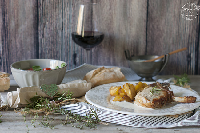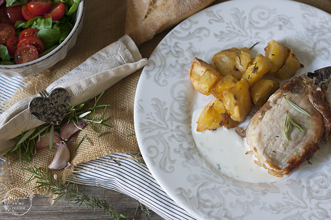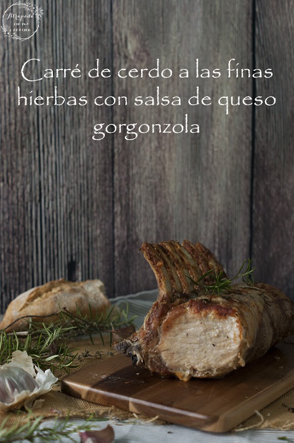 Yo compré un trozo de chuletero de cerdo y limpié la carne de alrededor del hueso para dejarlo con la forma de carré, aunque si no queréis meteros en tanto trabajo podéis pedirlo ya a vuestro carnicero. Lo he acompañado de unas patatas también a las finas hierbas y de una salsa de queso gorgonzola. Más fácil imposible.