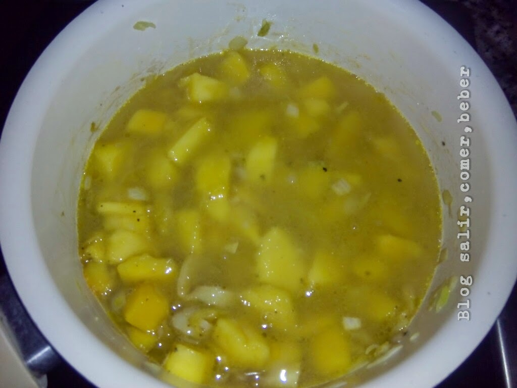 Para acompañar el carré hemos optado por hacer una salsa de mango, cortamos un par de dientes de ajo en láminas y los doramos en un cazo con un poquito de aceite, picamos la cebolleta, se la añadimos y dejamos pochar, una vez que han tomado color, le añadimos el mango troceado, una cucharada de azúcar, un chorrito de vinagre, un poco de sal y medio vaso de agua, dejamos cocinar durante unos 15 minutos, pasado este tiempo trituramos con la batidora y lo pasamos por un colador para eliminar impurezas.