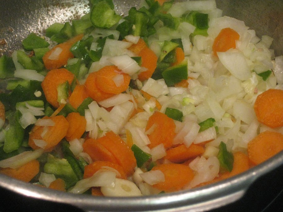 En el mismo aceite ponemos la cebolla, la zanahoria, el ajo y el pimiento verde y lo dejamos a fuego medio hasta que esté bien pochadito. No es necesario que lo piquéis muy chiquitito ya que luego trituraremos.