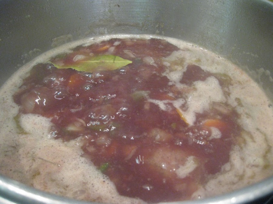 Una vez esté la verdura bien mareadita, añadimos la carne, el laurel, una pizca de clavo, como la punta de una cucharilla, el vino, un poco de sal y cubrimos lo que nos falte con agua. Dejamos hervir a fuego medio moviendo de vez en cuando. Yo lo he tenido hora y media, pero eso es porque hoy tenia tiempo, pero con 30 - 40 minutillos en la olla rápida queda igual.. Si lo hacemos en olla normal, ni que decir tiene que si vemos que se va a pegar o se queda demasiado seco se le va añadiendo un poquito de agua.