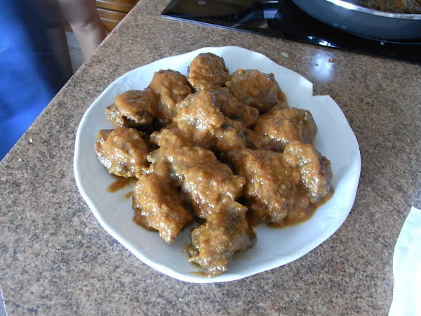 Se pone todo en la bandeja del horno y se mete a 150 grados 3 horas.Hay que vigilar de vez en cuando que la carne no se quede seca, sino hay que añadir agua y a media cocción darle la vuelta a la carne. Cuando la pincheis y esté blandita se pasa la carne a una cazuela o sartén.