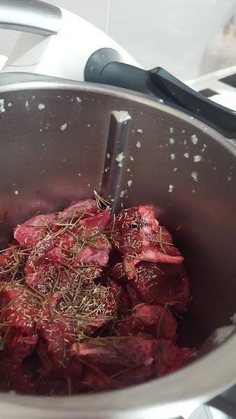3.- Terminado el tiempo incluimos en el vaso la carne, las hierbas, la pastilla de caldo, el vino y salpimentamos a nuestro gusto. Después programamos 50 minutos, temperatura Varoma, velocidad cuchara.