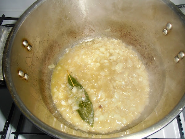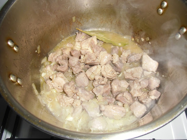 Retiramos la carne de la olla y en el mismo aceite rehogamos las cebollas y los dientes de ajo cortados muy finos.