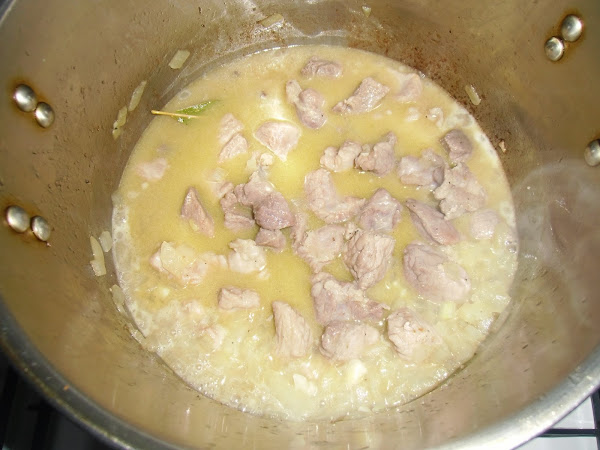 Agregamos un vaso de vino blanco, otro de vino tinto y cocinamos hasta que la carne quede blanda, añadiendo agua si fuese necesario.