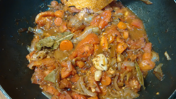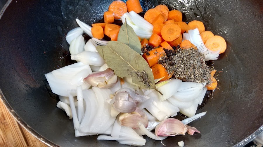 Cortamos las Zanahoria, la cebolla, los ajos machacados con la piel y en la misma sartén lo sofreímos junto con las especies.