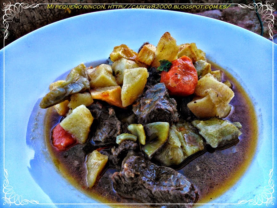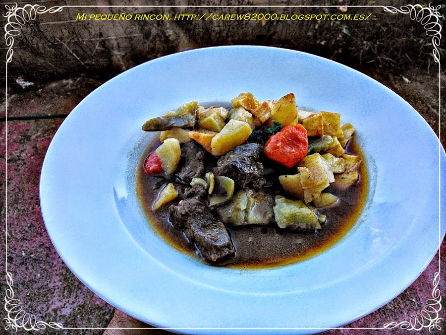Dejamos la carne hasta tenerla doradita añadimos las zanahorias contadas en trozos, ponemos los ajos, las alcachofas sin el agua, la cerveza de la tienda Cervetri y las pastillas de caldo, cubrimos con agua y dejamos cocinar en la olla exprés tapada de 15 a 20 minutos.