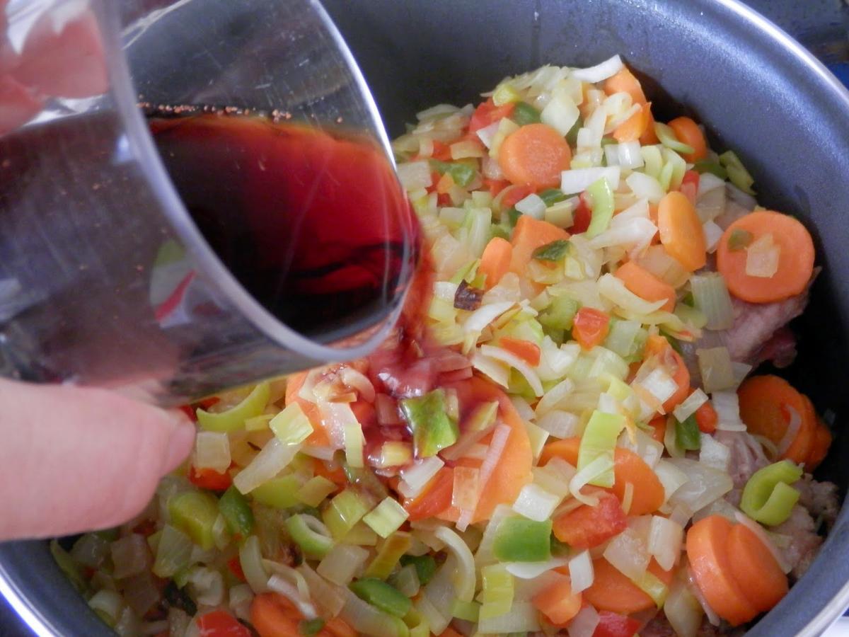 Pondremos las verduras a sofreír en ese aceite, cuando estén bien hechas, añadiremos el tomate y por último el vino, dejamos cocinar hasta que el vino evapore todo el alcohol.
