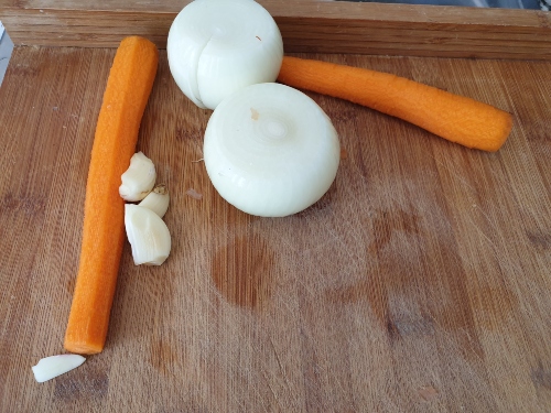 2- En el aceite que queda, pochar la cebolla en cascos, puerro y zanahoria en rodajas, hasta que esté blando, unos 15 minutos.