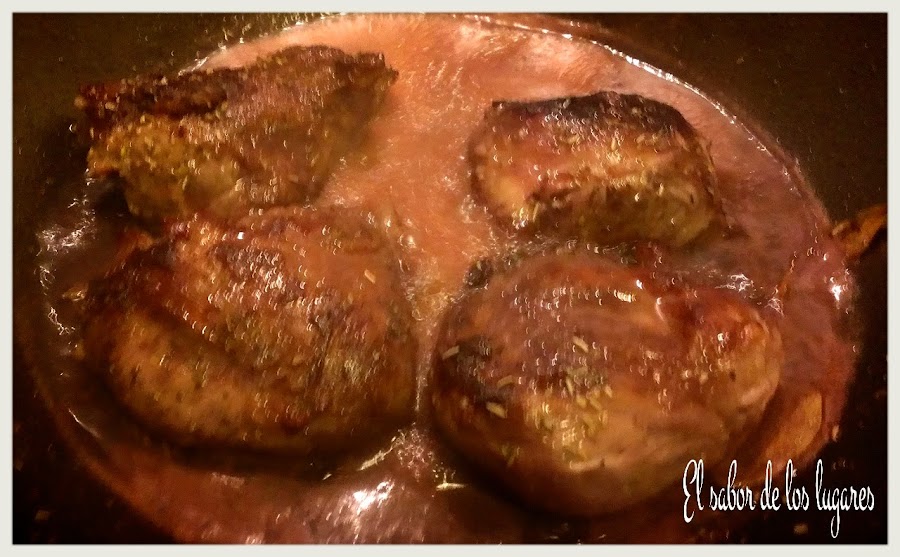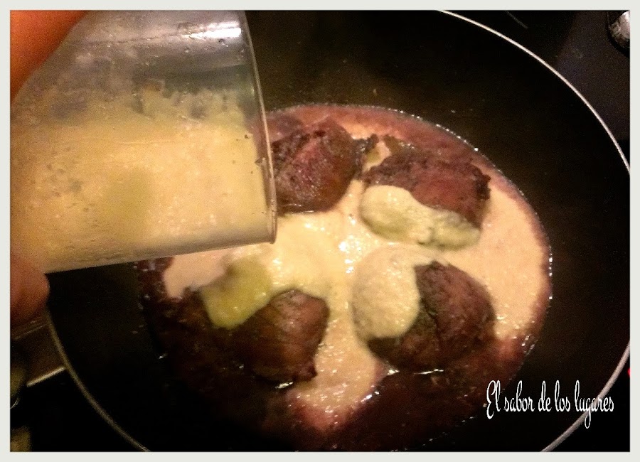 Una vez dorada, vierte el vino del adobo y el chupito de coñac, cocina 5-7 minutos hasta que se evapore el alcohol.