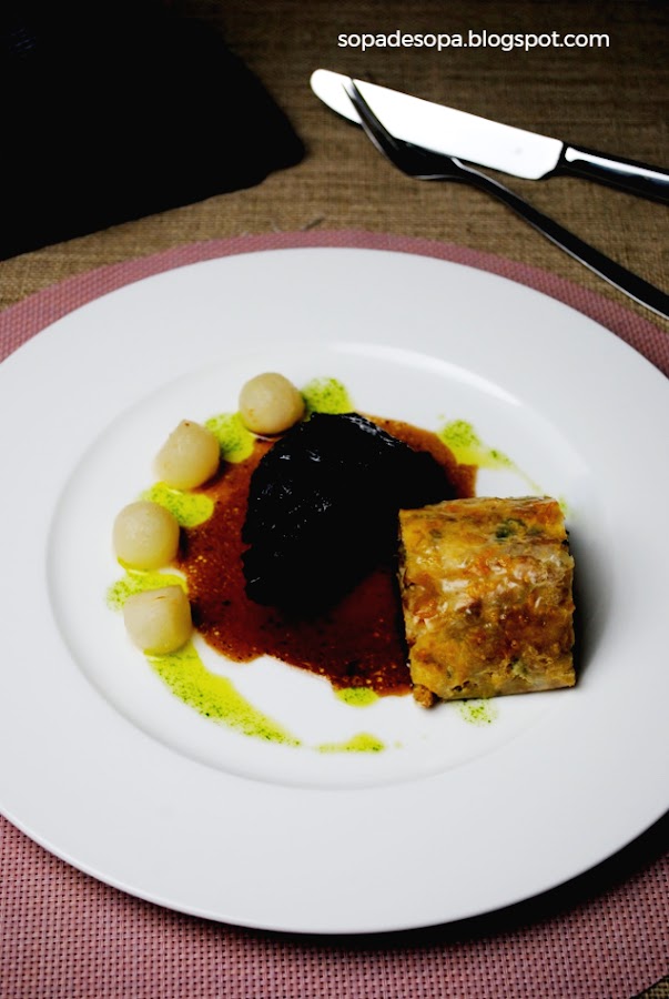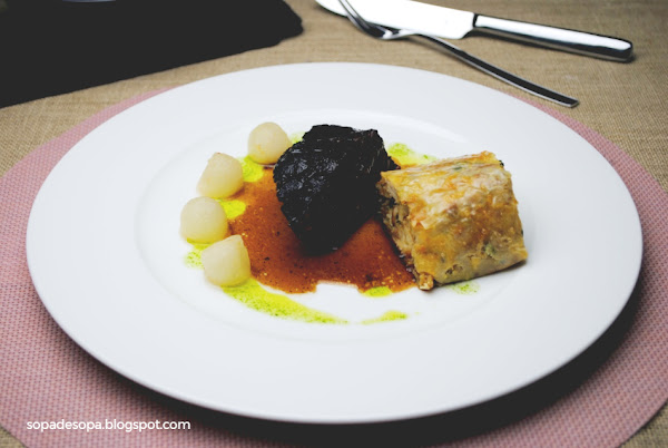 Carrillera de buey en reducción de vino tinto, Strudel de pan y pera Nashi