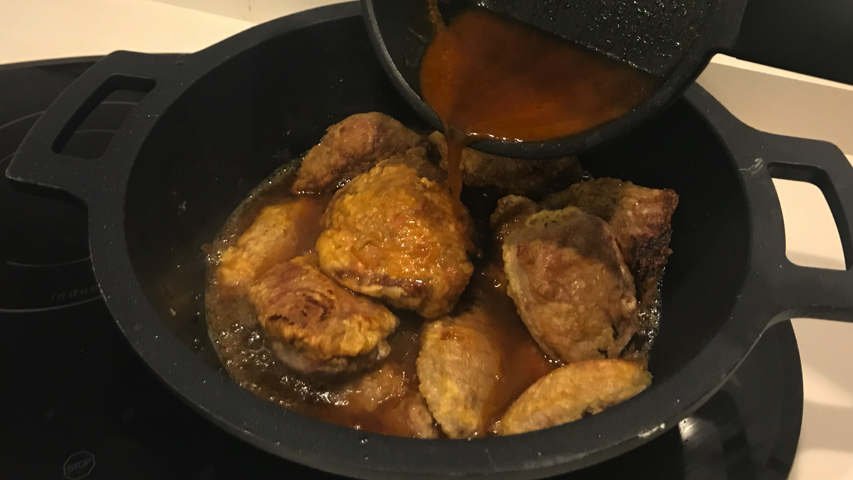 Regresa las carrilleras a la olla y vierte el contenido del cazo sobre ellas.
