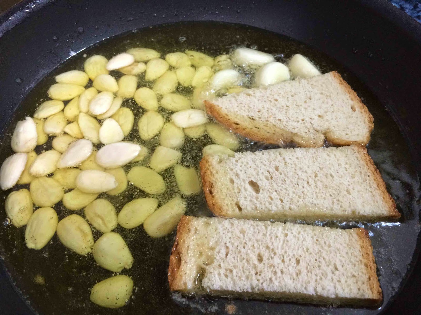 En una sartén aparte freímos los dientes de ajo, las almendras y el pan.