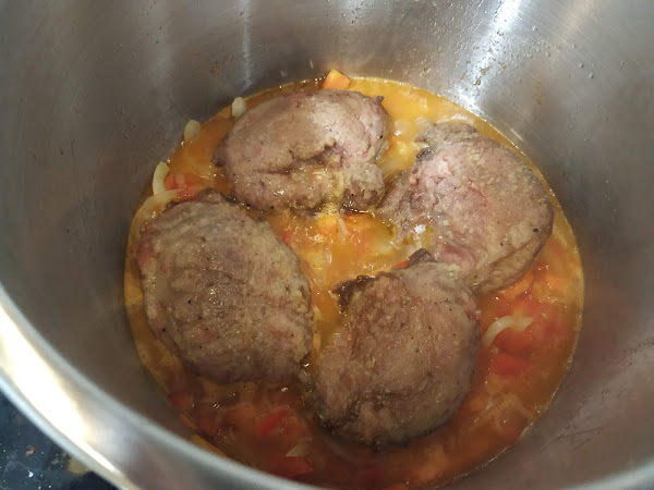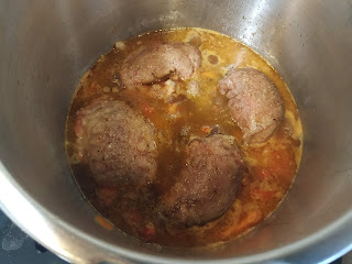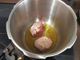 seguidamente pondremos la olla rápida con un chorrito de aceite, cuando esté caliente el aceite pondremos las carrilleras y las marcaremos por ambas partes, cuando estén doradas las sacaremos y reservaremos,