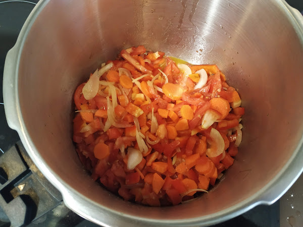 ahora cogeremos el puerro, lo lavamos y troceamos, hacemos lo propio con la cebolla y lo echamos todo en la olla, sazonamos y removemos y dejamos que poche durante 5 minutos,ahora cogeremos las zanahorias las pelamos, lavamos y cortamos en rodajas de unos 3 mm aproximadamente y las ponemos en la olla junto los demás ingredientes removemos y hacemos lo propio con el pimiento, lo lavamos cortamos en trocitos pequeños e introducimos en la olla removemos y pasamos a hacer lo mismo con los tomates y los dientes de ajo, los tomates los lavamos y troceamos e introducimos en la olla y los dientes de ajo, los pelamos, lavamos y los troceamos y los ponemos junto con las demás verduras, ahora dejamos que se pochen durante unos 10 min.,