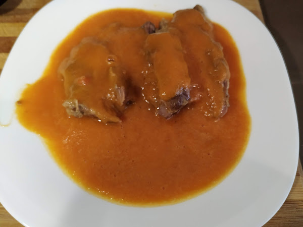 cuando tengáis batida la verdura la ponéis otra vez en la olla, ahora ponemos la carne junto a la salsa y dejamos a fuego medio/bajo durante 5 min. para que coja la carne todo el sabor de la verdura, una vez transcurrido este tiempo apagamos y procedemos a servir, emplatamos y a disfrutar de una carne que se deshace, espero que os guste, buen provecho
