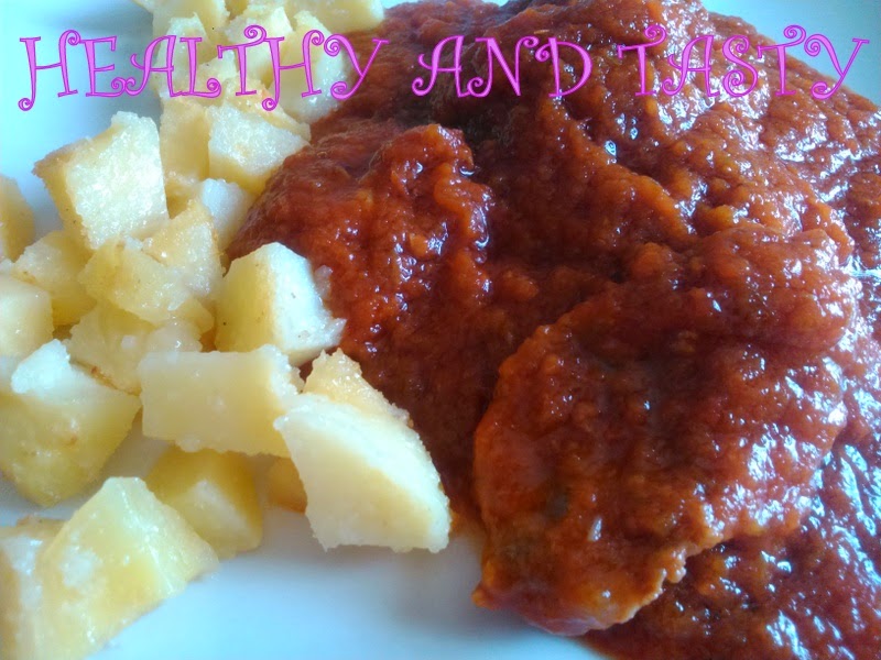 Primero lavamos la carne y le quitamos toda la grasa que pueda tener. En una olla, ponemos un poco de aceite de oliva y doramos a fuego medio los ajos pelados y laminados. Añadimos la carne y le echamos sal. Lo rehogamos un poco durante 5 minutos. Mientras tanto pelamos el tomate y lo troceamos junto con el pimiento y la cebolla y lo batimos todo con la batidora eléctrica. Una vez la carne esté rehogada, añadimos la mezcla del tomate y un poco de sal. Echamos la pizca de bicarbonato para eliminar la acidez del tomate y dejamos cocinar a fuego medio. Tapamos la olla rápida y cuando empiece a salir vapor, dejamos cocinar 10 minutos tapada. Destapamos la olla y seguimos cocinando hasta que la salsa de tomate se reduzca a la mitad. Probamos de sal y rectificamos si fuera necesario. Y listo!