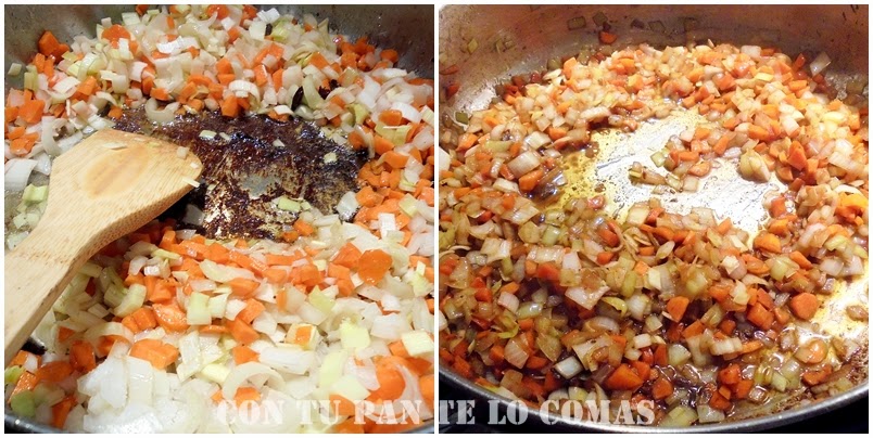 2. En el mismo aceite pochamos las verduras picadas bastante pequeñas, sazonamos con un poco de sal rascando bien el fondo de la cazuela para aprovechar todo el sabor.
