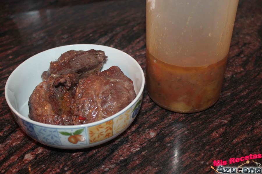 Trascurrido el tiempo sacaremos las carrileras y las reservamos, el contenido de la olla lo pondremos en el vaso de la batidora y yo suelo sacer los ajos, pero eso lo dejo a vuestra elección, lo batiremos bien para crear una salsa, pasarla por un colador y ya la tenemos lista, ahora la volvemos añadir a la carne y ya la tenemos terminada.