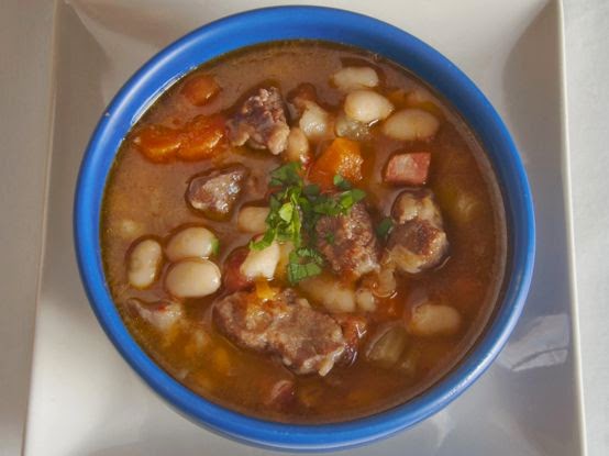 Retiramos el exceso de aceite, añadimos la carne, las judías y los cominos y cubrimos con el caldo. Tapamos la olla y dejamos hacer treinta o treinta y cinco minutos desde que comience a salir el vapor.