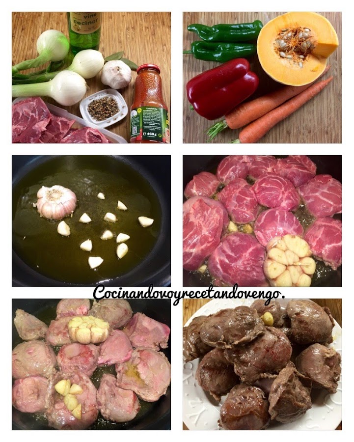 En la provincia de Cádiz la ganadería es muy común y suelen hacerse platos con carne de toro y de ahí el nombre de la receta, en la actualidad es más normal usar carne de ternera...yo esta salsa que está riquísima y es tan fácil de hacer (solo tiene un truco para que nos quede ese sabor tan único y especial), la preparo con diferentes carnes y siempre es un éxito, en esta ocasión con unas carrilleras han quedado espectaculares y la salsa pide pan y del bueno jajajajaja Hay diferentes versiones con más verduras o menos, otra versión muy popular es hacer la misma receta con tan solo ajos y cebolla, es decir con los ingredientes de la primera foto de abajo, yo suelo poner mucha verdura y luego la trituro, así las niñas no ponen pegas por los trocitos de pimientos etc y todos contentos :D