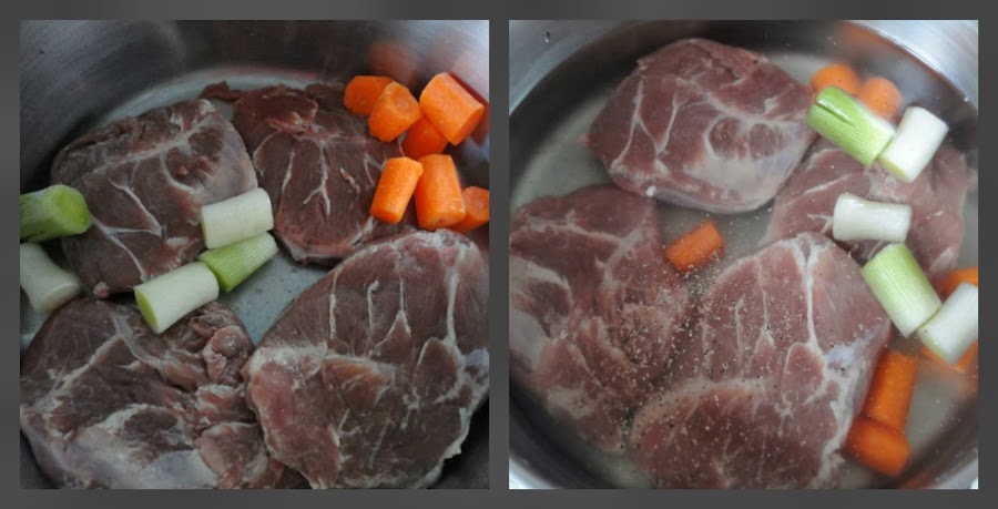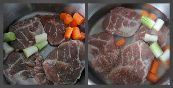 Limpiamos las carrilleras de pieles y grasa y, las ponemos en una cazuela con el puerro y la zanahoria troceada, cubrimos con agua, salpimentamos y dejamos cocer, a fuego lento, hasta que las carrilleras estén blandas.