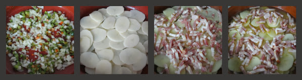 Cuando la cebolla esté blanda, agregamos las patatas peladas y cortadas en rodajas finas y, el bacon en tiras.