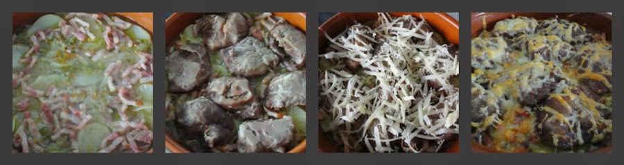 Pasado este tiempo, cortamos las carrilleras en rodajas y las colocamos en la cazuela de barro sobre las patatas. Espolvoreamos con el queso rallado y metemos al horno, con el gratinador encendido, durante 5 minutos.
