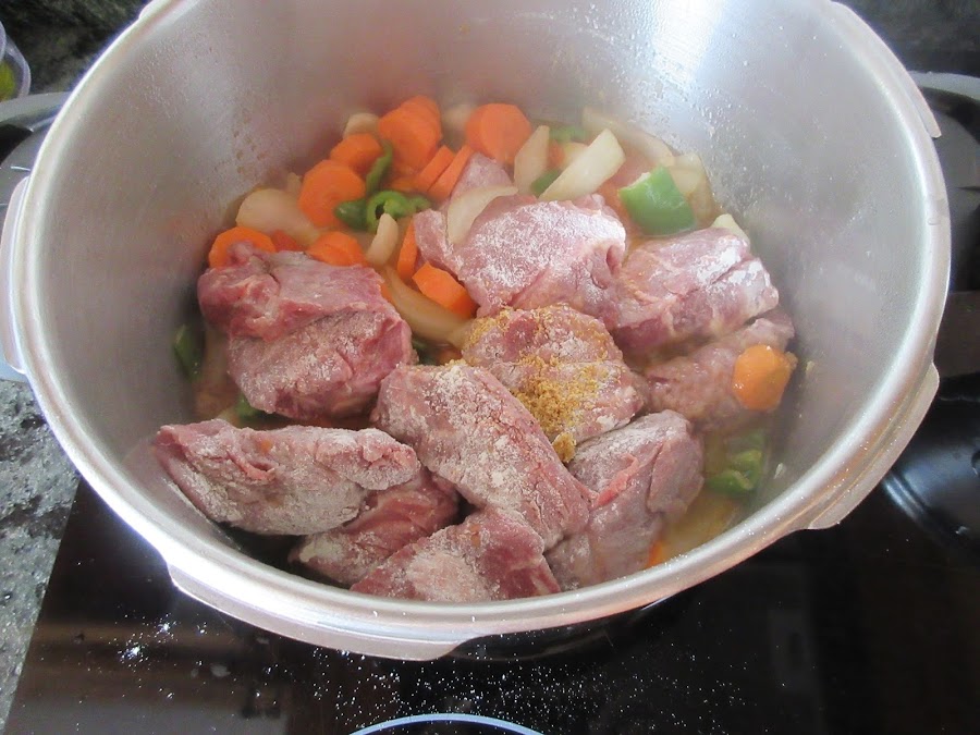 Las pasamos ligeramente por harina y a la olla, damos unas vueltas junto con las verduras, y añadimos el vino, dejamos que este evapore y añadimos el agua.