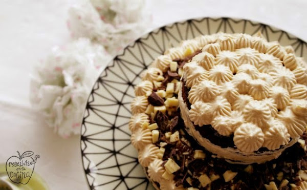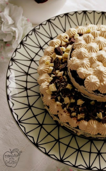En este caso la he dejado "desnuda" como la versión de Raquel. Solo la he cubierto por la parte el segundo piso con picos merengue y el primero un bordeado de picos de merengue y trocitos de chocolate blanco y negro de postres Nestle.