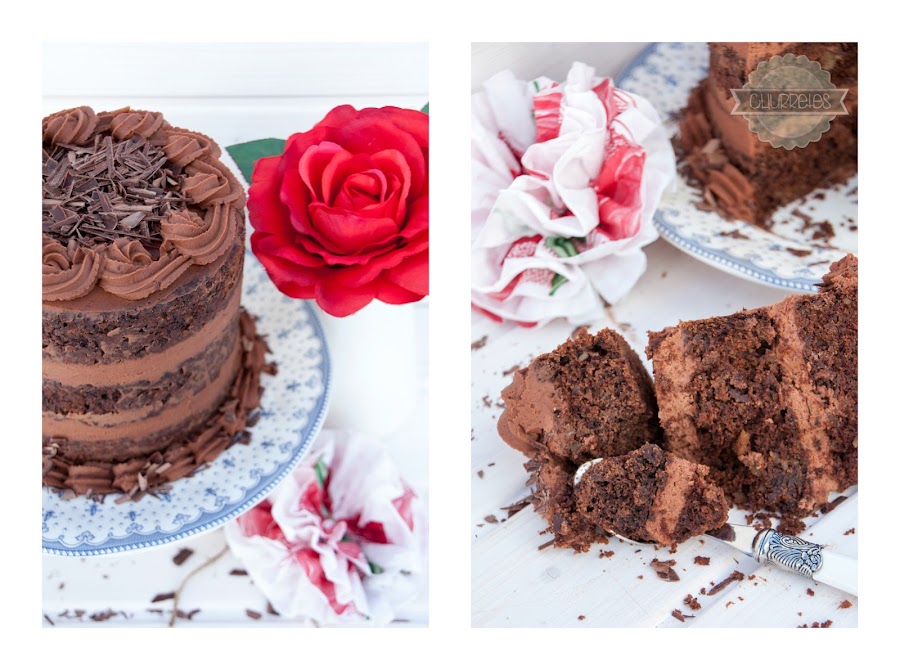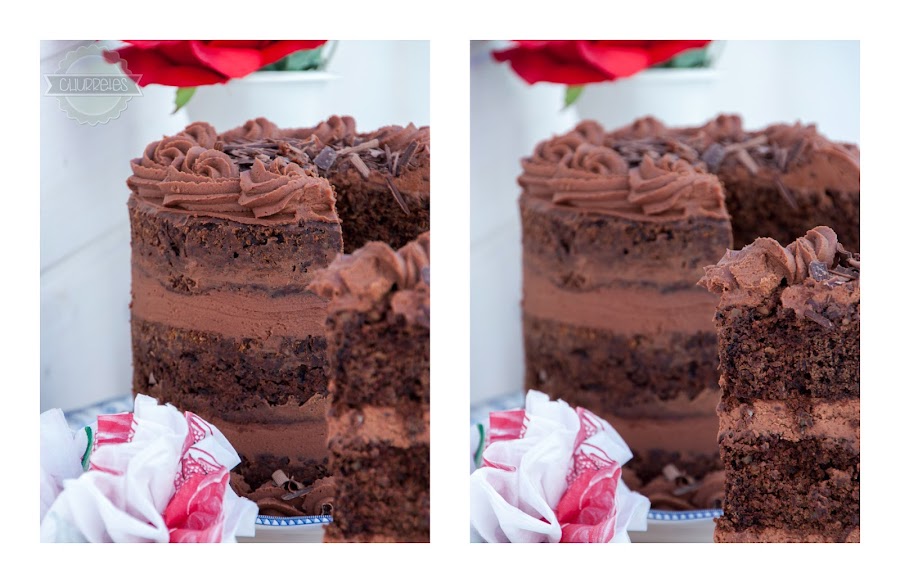 En este caso la he dejado "desnuda", es decir, que no la he cubierto nada más que por arriba, quedando al descubierto los laterales y pudiéndose a preciar las capas de bizcocho-crema.