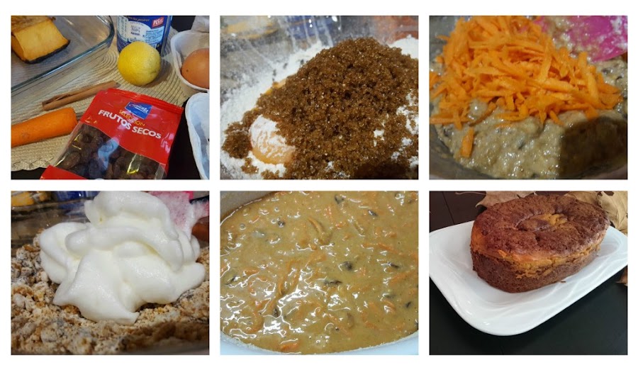 Rallamos las zanahorias, las mezclamos con la harina y la levadura tamizada, le añadimos las pasas, las nueces, el azúcar y las yemas de huevo. Lo mezclamos todo bien, incorporamos las claras batidas a punto nieve y lo mezclamos con movimientos envolventes. Engrasamos un molde, esparcimos un poco de harina por encima y vertemos la masa dentro. Precalentamos el horno a 180º C.