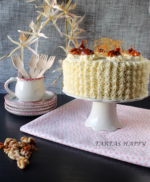 Nivelar los bizcochos para montar la tarta (siiii te puedes comer lo que sobra jijiji yo lo hice) rellenar con la crema y cuando ponemos la ultima capa la recubrimos con la crema y decoramos con la boquilla que mas nos guste yo usé una de estrella pequeña y decoré con unas nueces caramelizadas y en el centro hice un nido de caramelo.