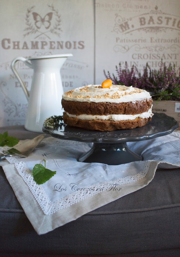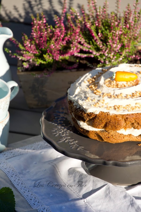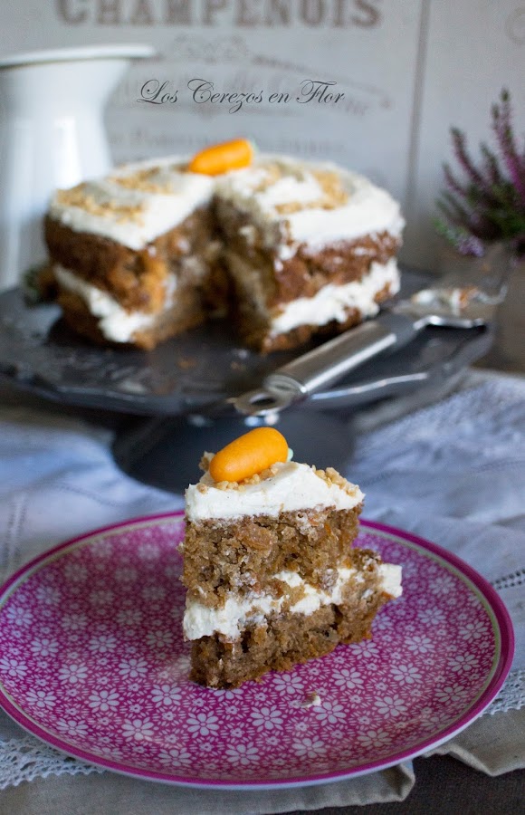 Este mes el chef propuesto es el desaparecido gran comunicador y cocinero Darío Barrio. La primera vez que lo vi fue en el programa matinal que presentaba la fallecida y gran periodista Concha García Campoy. Darío preparaba una receta diaria y me encantaba, primero como se expresaba y segundo la manera tan fantástica de presentar los platos, tenía un gusto exquisito. Mira que siempre he dicho que según que alimentos los mires por donde los mires son horrorosamente feos para fotografiar, pero él con sus toques de color, al salsear y el modo de colocarlos en el plato los dejaba perfectos para que el pollo se levantara del plato, se colgara el bolso y se fuera de marcha con un estilazo bestial. Luego me enganché al programa "Todos contra el chef". Me hacía mucha gracia cuando él no ganaba jajajaja, ponía una cara!! Si hubiera tenido tiempo me hubiera encantado hacer dos recetas en vez de una, porque realmente me ha resultado difícil elegir ya que todas me parecían buenísimas. Mis hijos desde el pasado jueves por la tarde están ya de vacaciones ( aleluya!!!! podré dormir durante dos semanas y olvidarme del despertador y de los deberes, y de limpiar camisetas y chándals y de preparar la merienda para el cole y....podré quedarme hasta tarde viendo la tele jajajajaja) así que el fin de semana hemos aprovechado para irnos fuera. Por eso hoy sólo os traigo un maravilloso Carrot Cake. Le vi prepararlo hace ya bastantes años en el programa Chocolateando de Canal Cocina que Darío presentaba. La receta es algo diferente pensando que quizá alguien más la haya podido preparar, por ello os traigo mi preferida que encontré en éste blog. Tengo que aprovechar que mi hija adora las zanahorias para meterlas en donde haga falta. Además que es el típico cake que me huele a otoño, a tierra mojada, a hojas secas en el suelo, a los días más cortos, a esos colores ocres de los árboles, a chimenea encendida...vamos, lo que vienen siendo el asqueroso fresquito. Ya he cagao el relato tan bucólico pastoril que estaba escribiendo jajajajaja, si es que no tengo remedio. Me quiero poner *fisna* pero enseguida me entra el ramalazo brutote. Pero mejor así, llevo unos días con un poquito de bajón bloggero, supongo que eso es normal después de tanto tiempo y necesito sacar mi lado bruto para reírme de mi misma y dejar las tristezas para cuando vea una peli de esas romanticonas que tanto me gustan. Siiiii, lo reconozco soy una fanática de las películas tontonas, de esas en las que los protagonistas se dan un golpe mientras caminan en una ciudad de dos millones de personas y de pronto hay una mirada, un flechazo y después dos horas de tonteo gracioso en la pantalla mientras lo acompaño de un delicioso carrot cake y un café bien calentito. Veis como ya os he metido un buen momento para tomar y disfrutar éste delicioso pastel? Jajajaja, si es que es bueno para desayunar, a media mañana cuando te entra el gurrigurri ese raro en el estómago, para merendar y antes de dormir. Y sabéis cuando va de maravilla éste cake? Pues para llevarlo a casa de una buena amiga y pasar una tarde de risas y confidencias. Así que con vuestro permiso yo quisiera compartir el mío con una amiga que quiero con locura y que la encuentro muchísimo a faltar y que además me dijo el otro día que tenía antojo de Carrot Cake!!!! Si es que me lee la mente mi Maragda, la búlgara cafeolé más guapa del mundo mundial! Nos ponemos a cocinar?
