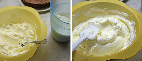 12. Montamos la nata (crema de leche) con la batidora (tiene que estar bien fría para que no se corte!) y vamos añadiendo poco a poco el azúcar glas. Cuando esté dura (nata montada (crema de leche)) la vamos añadiendo poco a poco al bol de la mantequilla y el queso y vamos mezclando hasta que quede todo bien integrado.