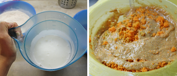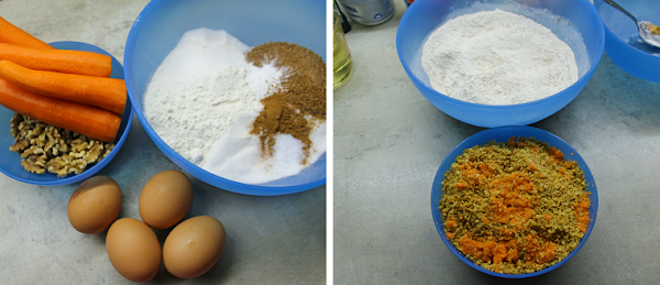 9. Ahora mezclamos poco a poco los ingredientes secos del otro bol con el de los huevos batidos hasta conseguir una masa homogénea. Después añadimos también la zanahoria y las nueces picadas.