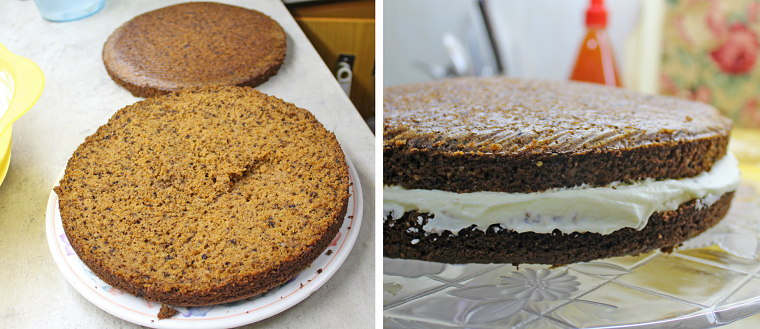 15. Ya solo nos queda rellenar el bizcocho con la crema. No hay que quedarse corto rellenando, pero hay que llevar cuidado no nos quedemos sin crema para recubrir el bizcocho por fuera!