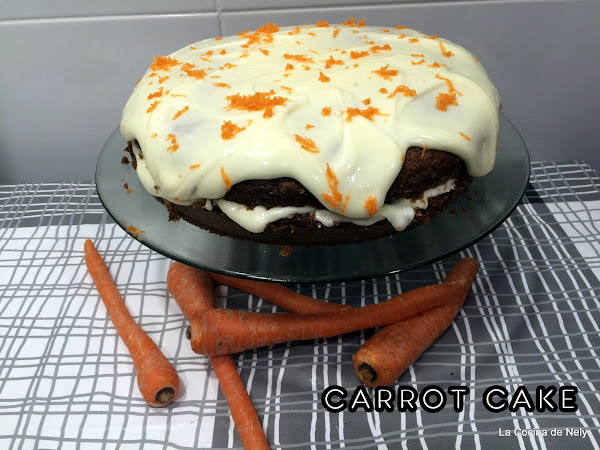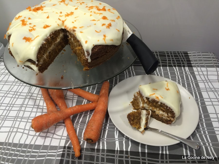 Cortamos el bizcocho en dos y rellenamos con la mitad de la crema, tapar con el bizcocho y verter el resto de la crema y dejamos caer por los extremos para que quede bonito, para decorar rallamos un poco zanahoria rallada.