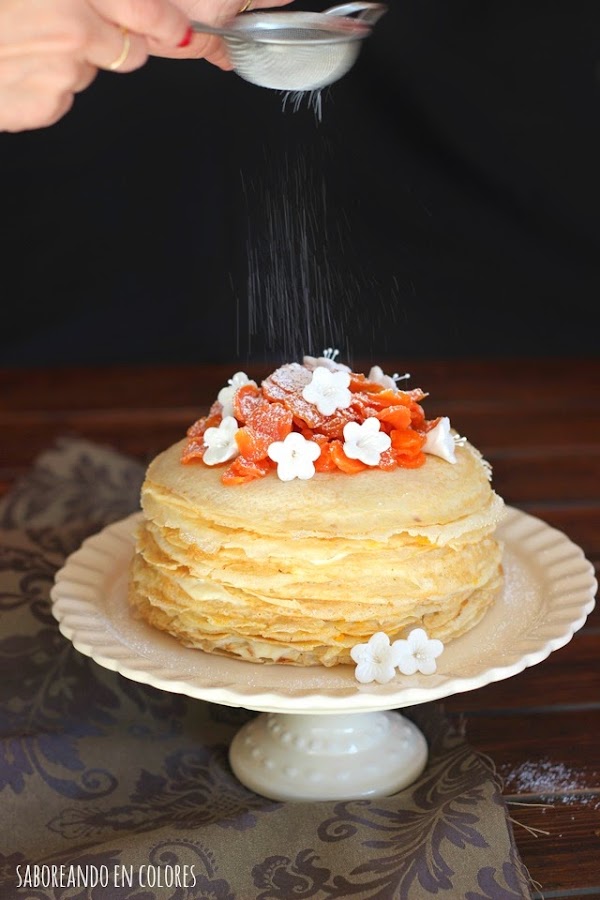 Vamos ahora con el montaje de la tarta:Para montar la tarta iremos alternando crepes con una capa de natillas y otras de crema de zanahorias. Es decir, primero un crepe, luego una capa de natillas, encima otro crepe, luego una capa de crema de zanahorias, y así sucesivamente. Cuidado con poner relleno de más, porque si nos pasamos los crepes empiezan a resbalar...