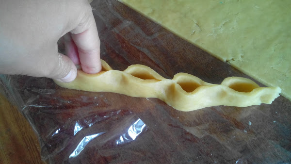 Pasado el tiempo amasamos nuevamente para asegurarnos que esta suave y aplanamos a menos de 1/2 cm. Cortamos tiras de 30 cm y doblamos por la mitad, luego vamos uniendo las mitades dejando un dedo de por medio para que quede como en la imagen de abajo.
