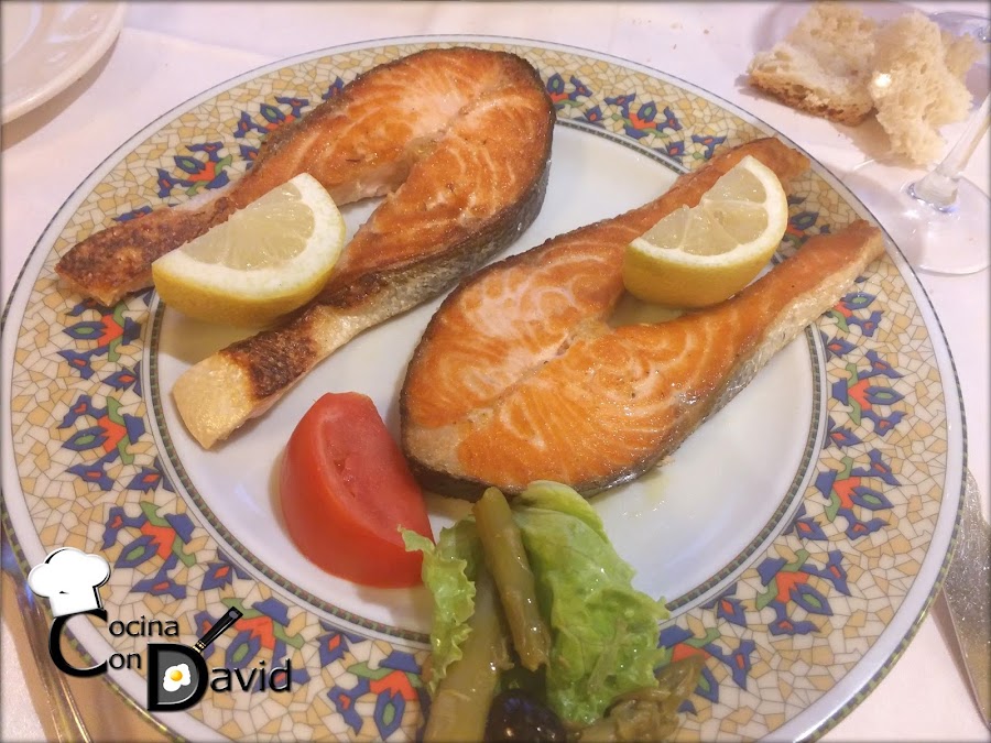 Otro de los comensales, pidió el "Salmón a la plancha". Una ración generosa, con dos buenas tajadas, donde lo importante es el salmón. Quizás como guarnición hubiese puesto otra cosa.