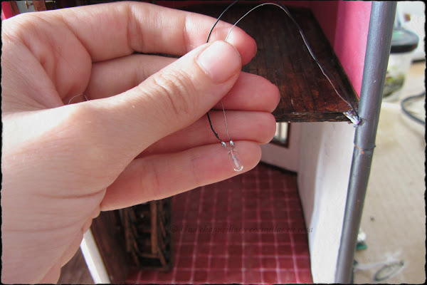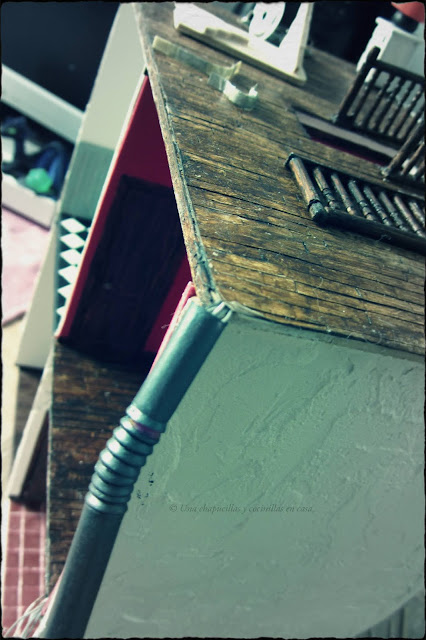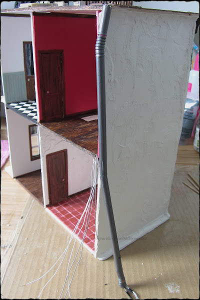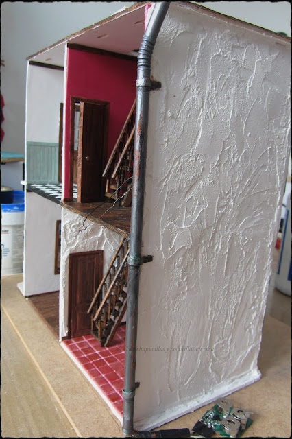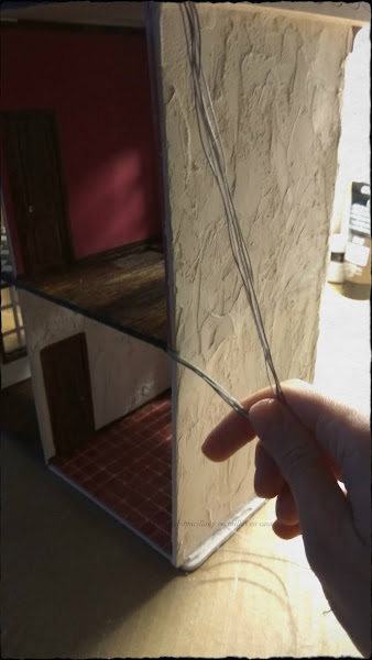 Esta es una foto vieja, es de los comienzos del montaje y ahí habia pasado el cableado de la lampara de la entrada, cocina y baño y se pueden ver colgando en la esquina del suelo del salón. Y es que el cableado esta en dos grupos de cables, las lamparas que os he dicho y luego la lampara del salón junto con las lamparas del ático y a todo esto sumé una pequeña bombilla para una chimenea que he montado a dia de hoy en el salón y que en entradas posteriores os enseñaré.