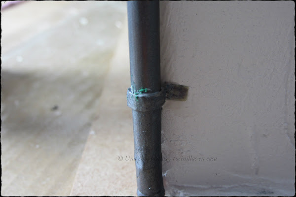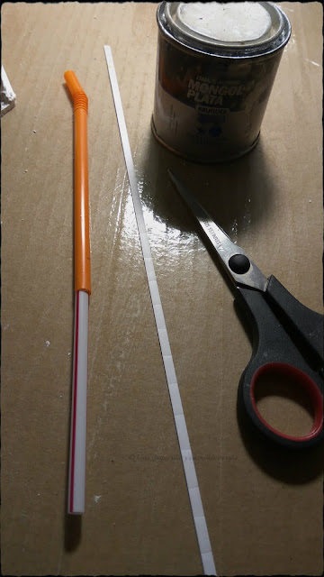 Pues bien, la idea es meterlos en una vieja tubería que tiene la casa en el exterior. Para ello usé unas pajitas, una tira de papel y pintura plateada.